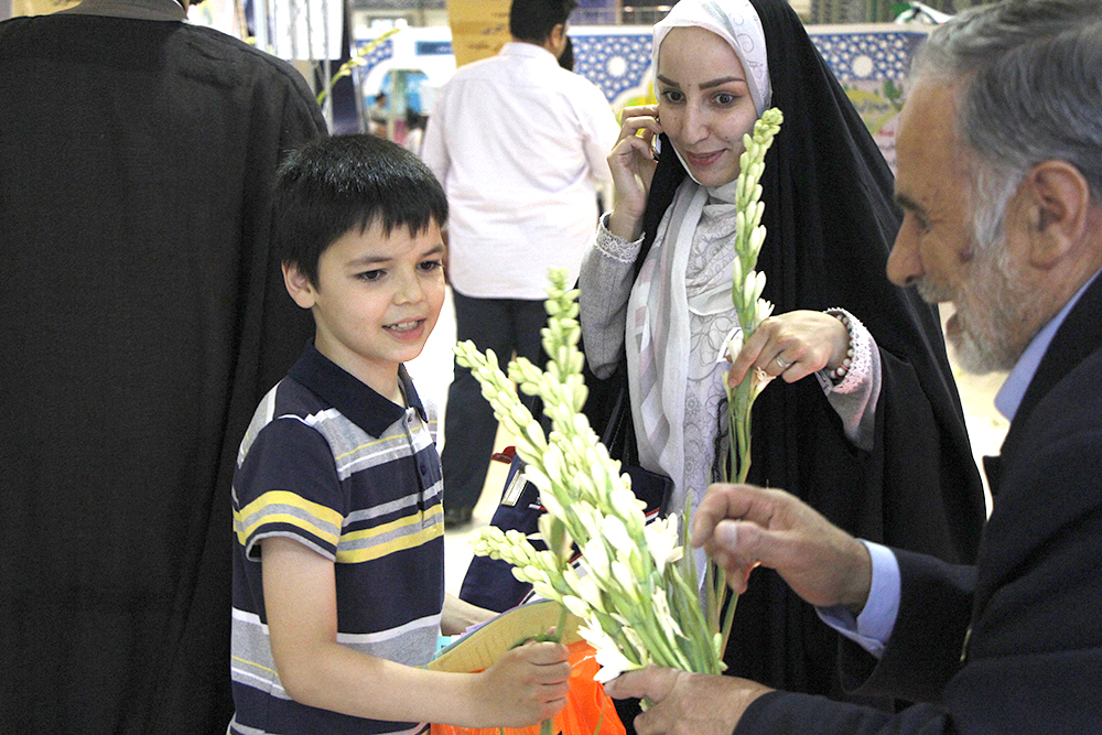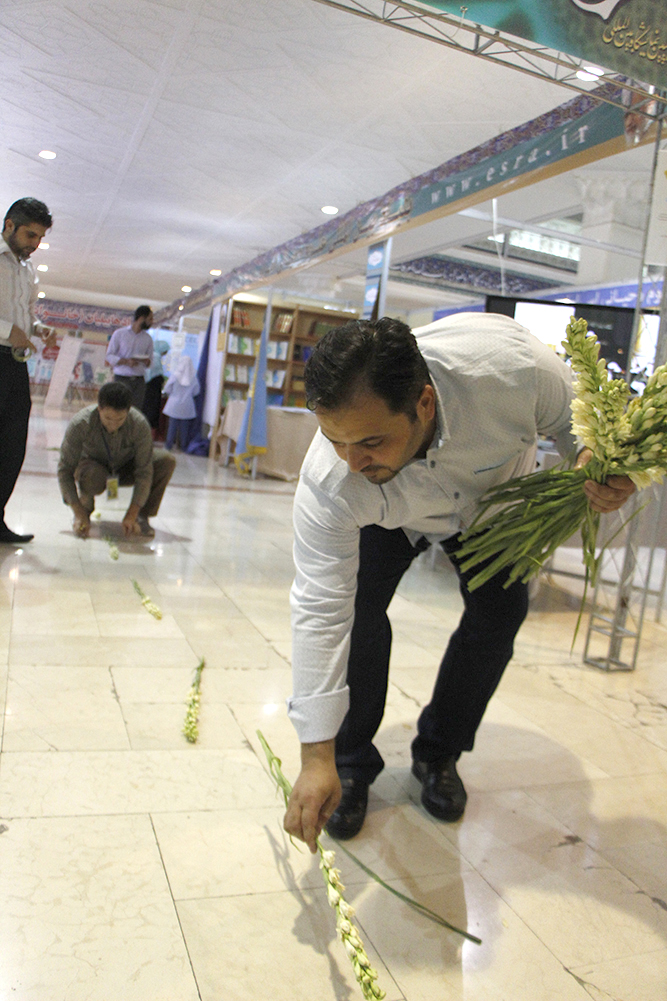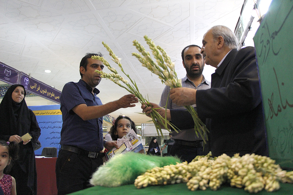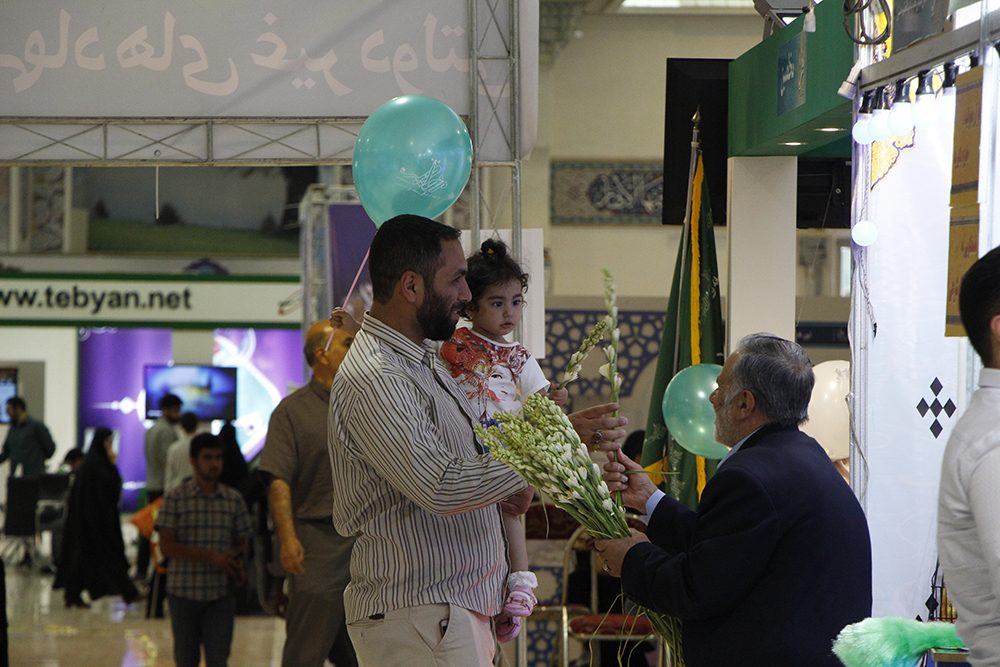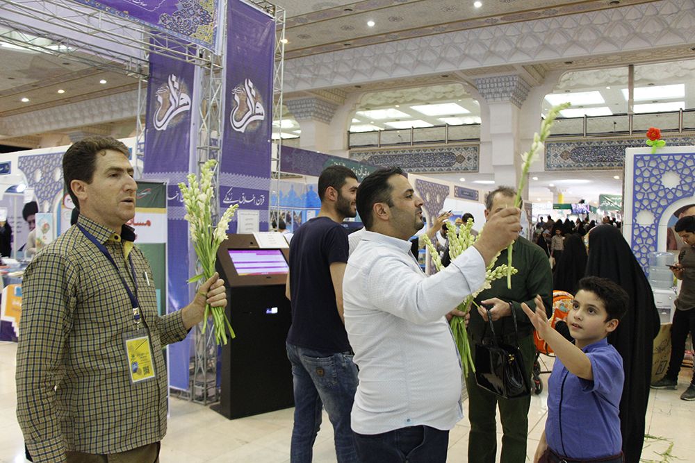 اهداء گل به بازدیدکنندگان نمایشگاه قرآن در شب ولادت امام حسن مجتبی (ع) - عکاس : بیژنی