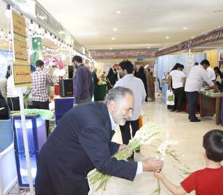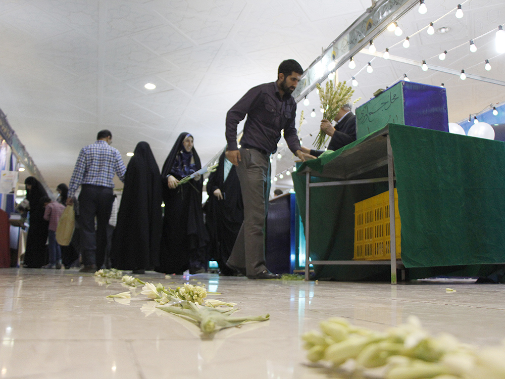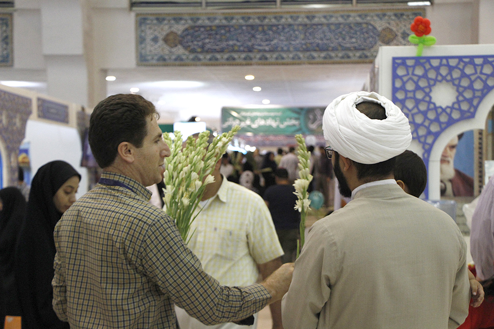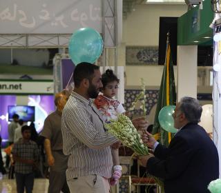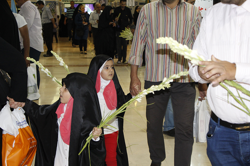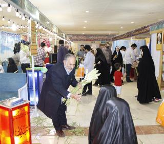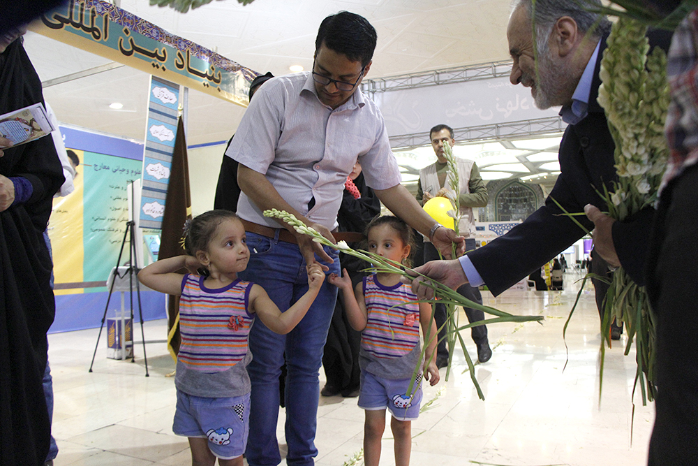 اهداء گل به بازدیدکنندگان نمایشگاه قرآن در شب ولادت امام حسن مجتبی (ع) - عکاس : بیژنی