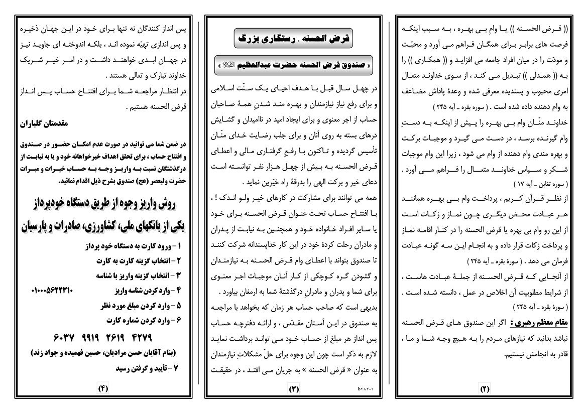 همچنین خیرین گرامی می توانند برای تحقق اهداف خیرخواهانه و به نیابت درگذشتگان خود نیز توسط دستگاه های خودپرداز بانک های، ملی، کشاورزی، صادرات و پارسیان به شماره کارت 4279-2619-9919-6037 و از طریق شناسه واریز "010005622310" اقدام به واریز وجوه به حساب خیرات و مبرات حضرت ولی عصر(عج) نمایند.