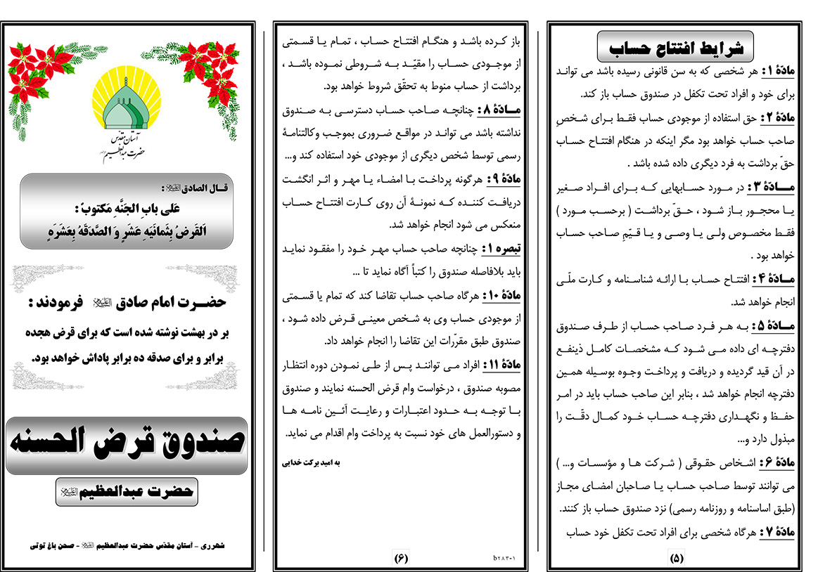 به گزارش روابط عمومی آستان مقدس حضرت عبدالعظیم(ع)، علاقه مندان جهت افتتاح حساب می توانند با مراجعه به صحن باغ طوطی، بخش صندوق قرض الحسنه آستان مقدس، در این امر خداپسندانه مشارکت کنند.