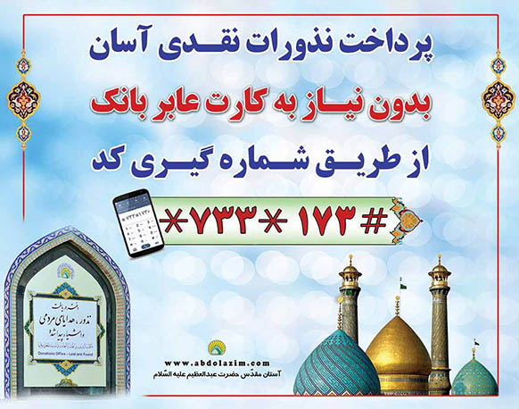 به گزارش اداره ارتباطات آستان مقدّس حضرت عبدالعظیم علیه السّلام، زائرین و خیرین محترم این بارگاه ملکوتی از این پس می توانند برای پرداخت نذورات و هدایای نقدی خود علاوه بر پرداخت از طریق خودپردازهای بانک سینا در سراسر کشور و همچنین شماره گیری کد USSD بانک سینا که پیش از این اطلاع رسانی شده بود (کد # 173*727* ) ،  از طریق شماره گیری کد USSD شرکت آسان پرداخت بر روی گوشی های همراه خود نیز نذورات و وجوهات اهدایی خود را پرداخت نمایند.