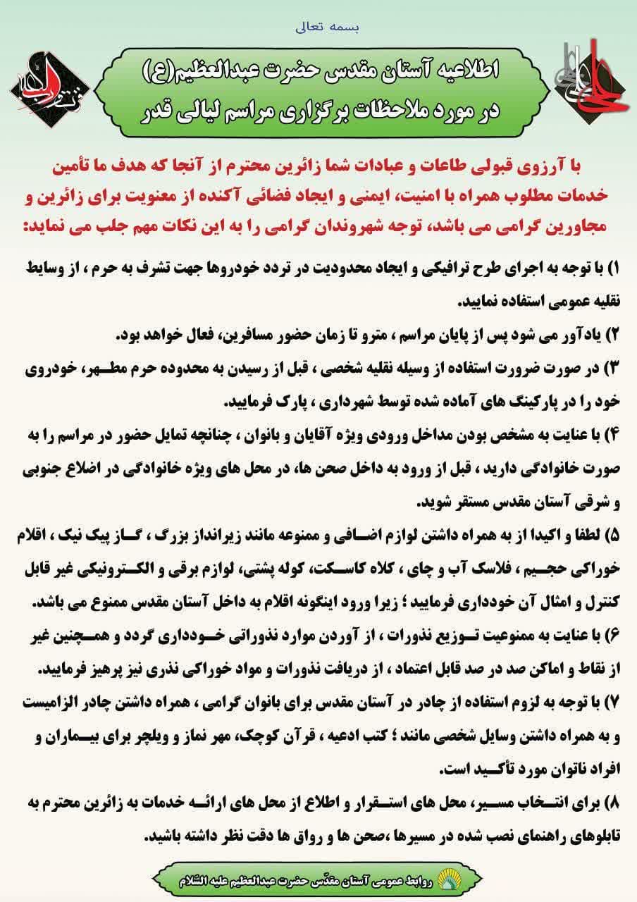 اطلاعیه آستان مقدس در مورد ملاحظات برگزاری مراسم لیالی قدر