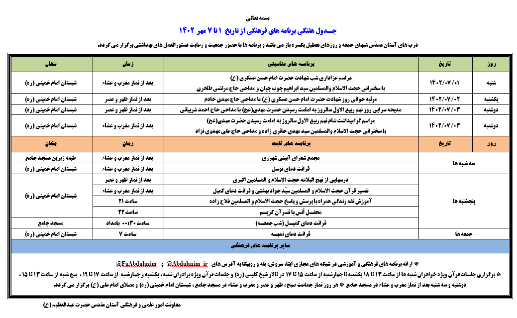 اعلام برنامه های هفتگی آستان مقدّس از 1 مهر لغایت 7 مهر ماه