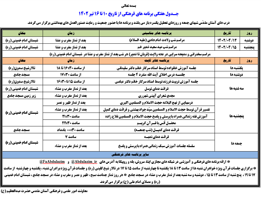 اعلام برنامه های هفتگی آستان مقدّس از 10 تا 16 تیر ماه