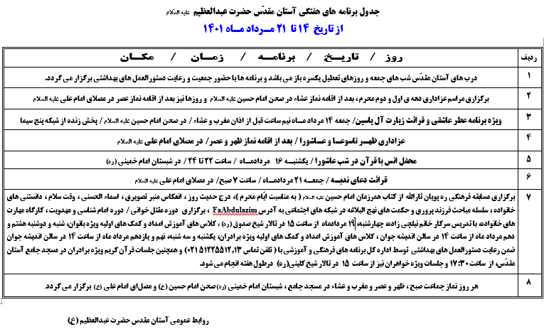 اعلام برنامه های هفتگی آستان مقدّس از 14 تا 21 مرداد ماه