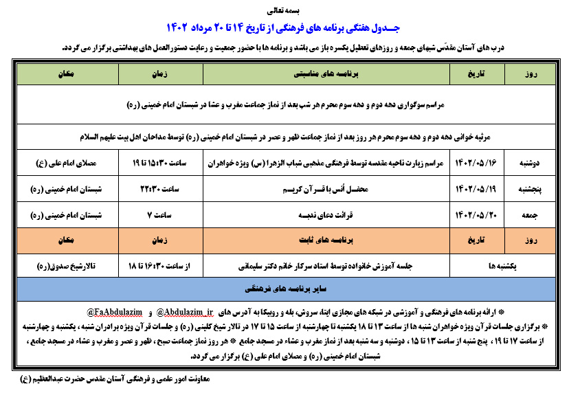 اعلام برنامه های هفتگی آستان مقدّس از 14 لغایت 20 مرداد ماه