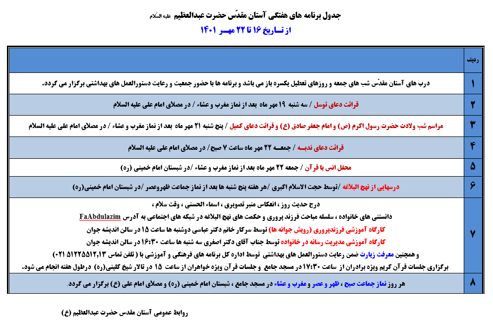 اعلام برنامه های هفتگی آستان مقدّس از 16 تا 22مهرماه