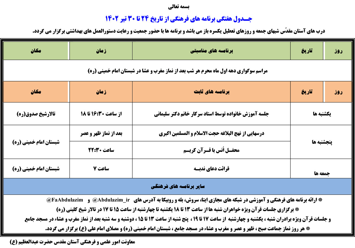 اعلام برنامه های هفتگی آستان مقدّس از 24 تیرماه لغایت 30 تیر ماه