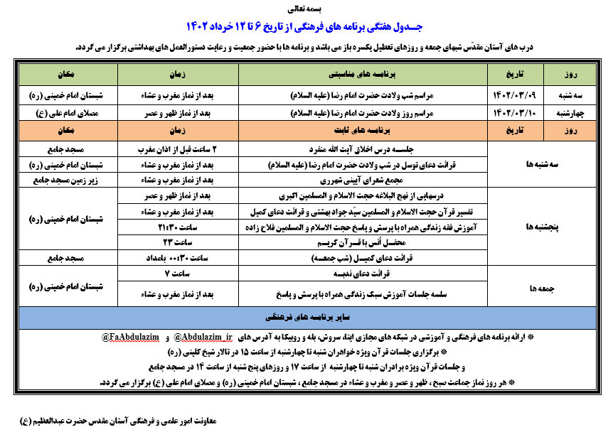 اعلام برنامه های هفتگی آستان مقدّس از 6 تا 12 خرداد ماه