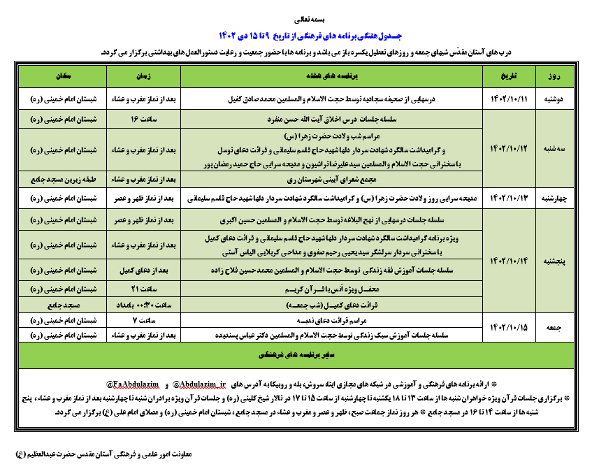 اعلام برنامه های هفتگی آستان مقدّس از 9 دی لغایت 15 دی ماه