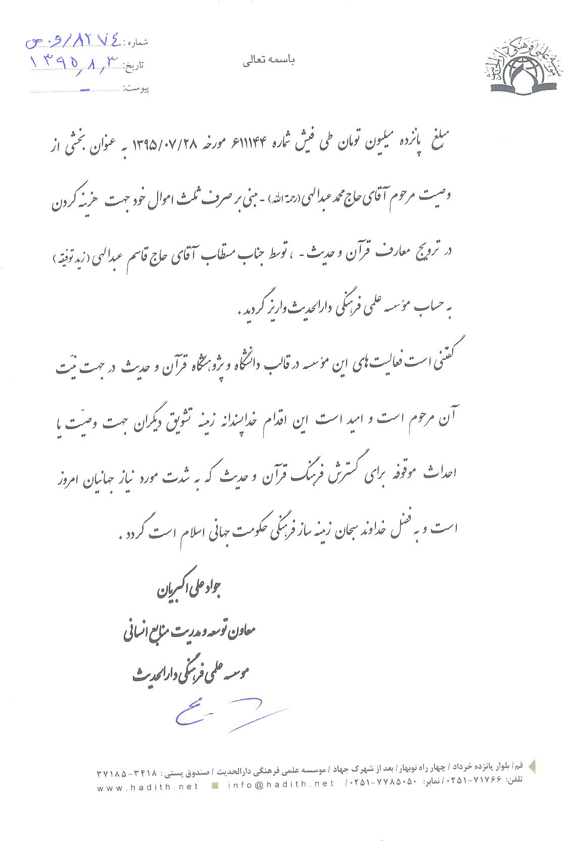 ورثه مرحوم حاج محمد عبدالهی بنا به وصیت پدر ، بخشی از ثلث اموال پدر را برای هزینه ترویج معارف قرآن و حدیث به حساب موسسه علمی فرهنگی دارالحدیث واریز کردند .