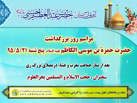 مراسم بزرگداشت حضرت حمزه بن موسي الكاظم عليهما السّلام در روز پنجشنبه 21 مردادماه از ساعت 18:30در آستان مقدّس حضرت عبدالعظيم عليه السّلام برگزار ميگردد .