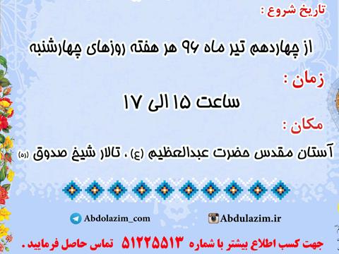 به گزارش روابط عمومی آستان مقدس حضرت عبدالعظیم حسنی علیه السلام، این برنامه از 14 تیر ماه آغاز شده و در روزهای چهارشنبه از ساعت 15 الی 17 بمدت بیست جلسه برگزار خواهد شد.
