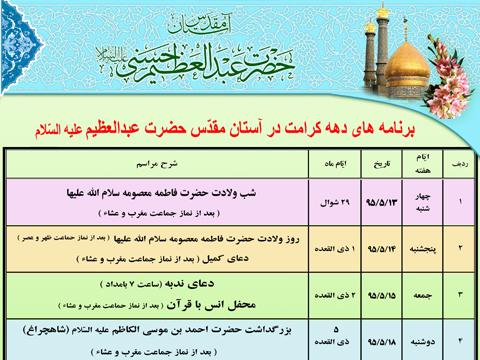 به گزارش اداره ارتباطات آستان مقدّس حضرت عبدالعظيم عليه السلام، ويژه برنامه شب و روز ميلاد حضرت فاطمه معصومه (س)، آيين بزرگداشت حضرت احمدبن موسي الكاظم (ع) (شاهچراغ)، آيين بزرگداشت حضرت حمزه بن موسي الكاظم (ع) و تعويض پرچم و غبارروبي مضجع شريف آن حضرت، ويژه برنامه شب و روز ميلاد حضرت ثامن الحجج علي بن موسي الرضا (ع)، دو محفل انس با قرآن ويژه عموم زائران و دو محفل انس باقرآن ويژه خواهران از جمله برنامه هاي دهه كرامت در آستان مقدّس حضرت عبدالعظيم عليه السّلام مي باشد.