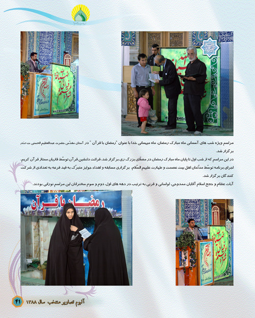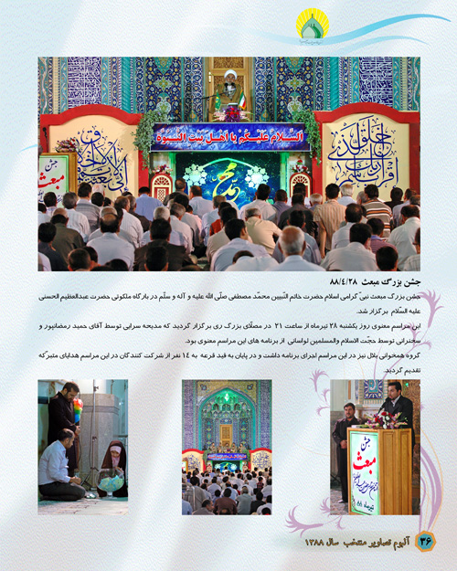 Celebrations of Shaban Month in the Holy Shrine of Hazrat...Iranian new year( NOWRUZ) ceremony in holy shrine - 1396...Celebrating the Anniversary Birth of Imam Mahdi (as) with...Holy shrine's photosHoly shrine of Hazrat Abdul Azim Hasani (PBUH) Statement...Hosting Fast Pilgrims in Blessed Month of Ramadan in the...Top trainees of Holy Shrine's Quran Training Centre were...Ceremony of ITIKF( prayer seclusion) in central mosque...Celebration on the Eid –e-Mab'as", the celebration of... Time schedule of various religious events which will be...