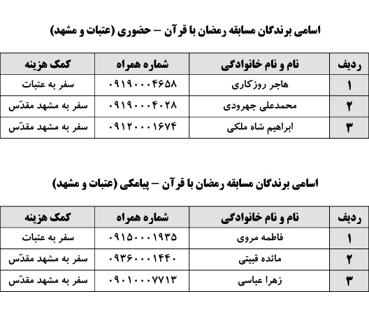 اعلام اسامی برندگان مسابقه فرهنگی قرآنی رمضان با قرآن