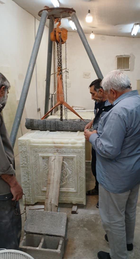 عملیات حجاری سنگ مزار، توسط جمعی از هنرمندان برجسته شیراز و به سرپرستی استاد محمدجواد شبیه، در حال اجراست. این گروه هنرمند با بهرهگیری از مهارتهای سنتی و نوآورانه، نقوش و کتیبههای معنوی و هنری را بر سنگ مرقد شریف حکاکی کردهاند.